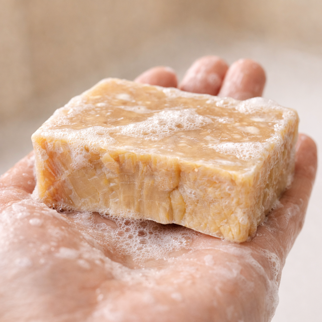 Appliquer sur peau mouillée, faire mousser puis rincer. Éviter le contact avec les yeux.